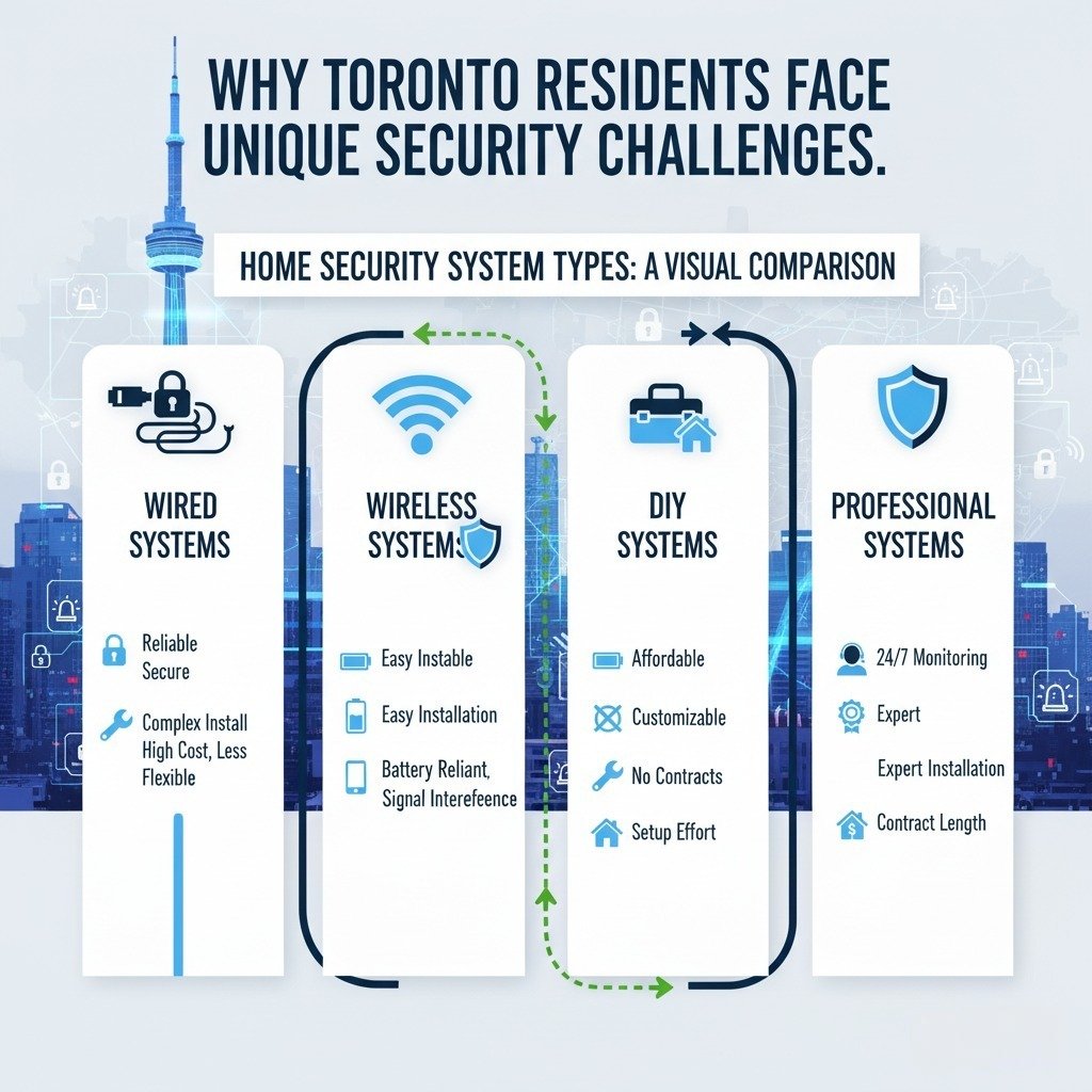 To protect your Toronto home or business, assess your specific security needs and choose a system, be it a budget-friendly DIY setup, a wireless professional solution, or a comprehensive wired installation with 24/7 monitoring that aligns with your requirements and Toronto’s unique challenges. Compare providers like United Security, with over 20 years of local expertise, to invest in a reliable security solution that ensures your safety, your family’s wellbeing, and your property’s protection.