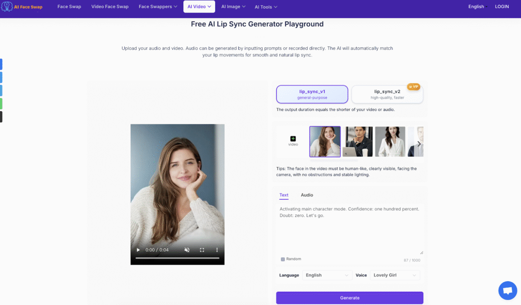 In the fast-paced world of digital content, video quality and engagement go hand in hand—and nothing ruins a great video like mismatched audio and lip movements. Enter the AI lip sync generator from aifaceswap.io: a game-changing tool that merges cutting-edge AI lip sync technology with the power of AI face swap to deliver seamless, professional-grade results. Designed for content creators, businesses, educators, and game developers alike, this free online tool lets you sync voice to any video in seconds, no manual editing or specialized skills required. With AI face swap at its core, it ensures ultra-realistic lip movements that bring characters, presenters, and avatars to life, making it easier than ever to create multilingual, engaging content that resonates with global audiences.