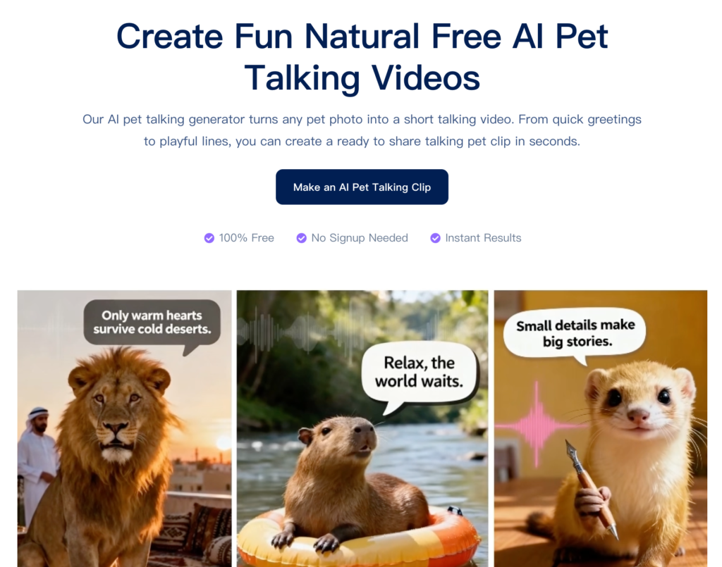 Losing a pet is heartbreaking. AI Pet Talking offers a gentle way to honor their memory. Using old photos or videos, owners can create farewell messages or “letters from beyond the rainbow bridge” that feel intimate and healing. Many users report that hearing their pet’s synthesized voice say “Thank you for loving me” brings closure and comfort.