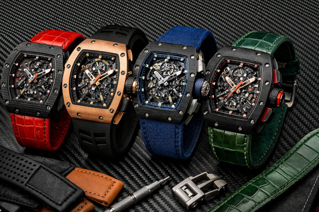 Most buyers begin by looking at color first, but material should lead the decision. Richard Mille pieces have an athletic yet luxurious identity, so the strap has to balance comfort, durability, and visual impact.