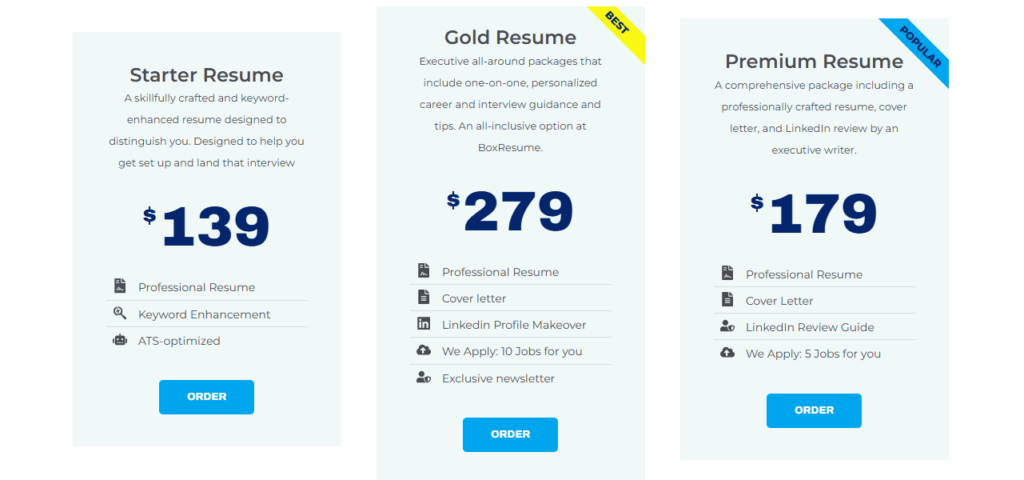BoxResume pricing varies based on experience level and service depth: