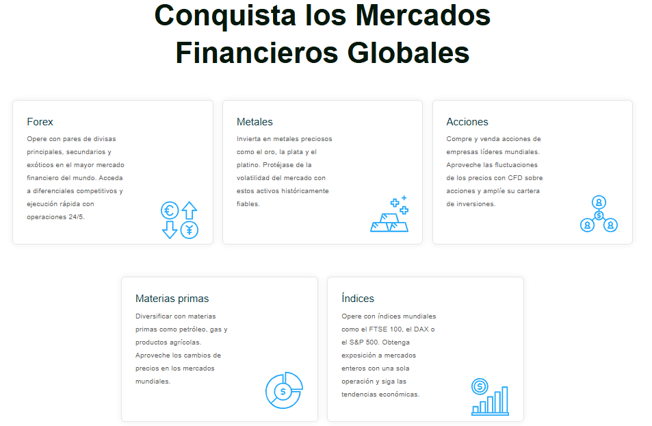 Ya seas un trader experimentado o estés comenzando, esta plataforma ofrece una amplia gama de oportunidades en varios mercados, incluidos el forex, las criptomonedas, las acciones, las materias primas y los índices.