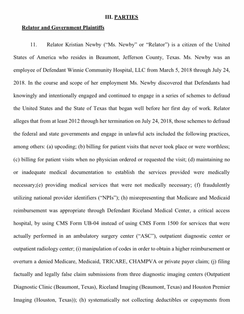Documents released by the U.S. Department of Justice show that the fraud case—United States of America et al. v. Riceland Healthcare System, LLC et al.—was initiated by the U.S. Department of Justice (DOJ) and the State of Texas under the False Claims Act in August 2018.