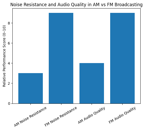 The results prove that FM broadcasting is more effective in terms of sound quality and resistance to interference, which determines its supremacy in the music broadcasting. The overall bandwidth needs and the low range of coverage however limit its application in long-distance communication.