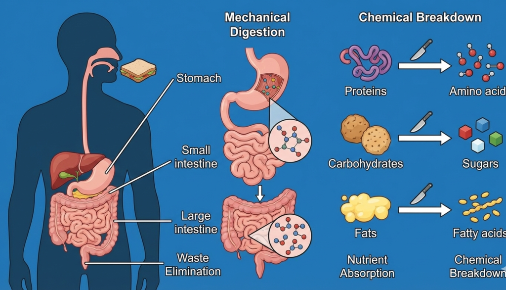 Digestion is a complicated yet very effective process that converts nutrition into life giving food. The digestive system decomposes carbohydrates, proteins, fats, vitamins, and minerals into absorptive forms through well-coordinated mechanical and chemical processes.