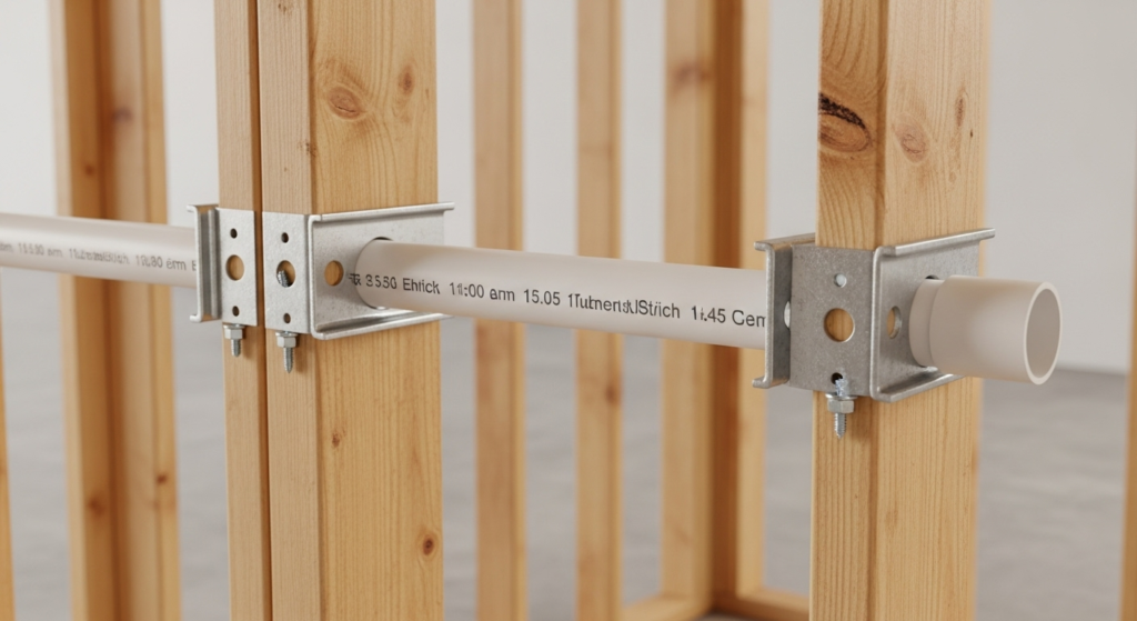 Caption: Pipe supports fixed to framing