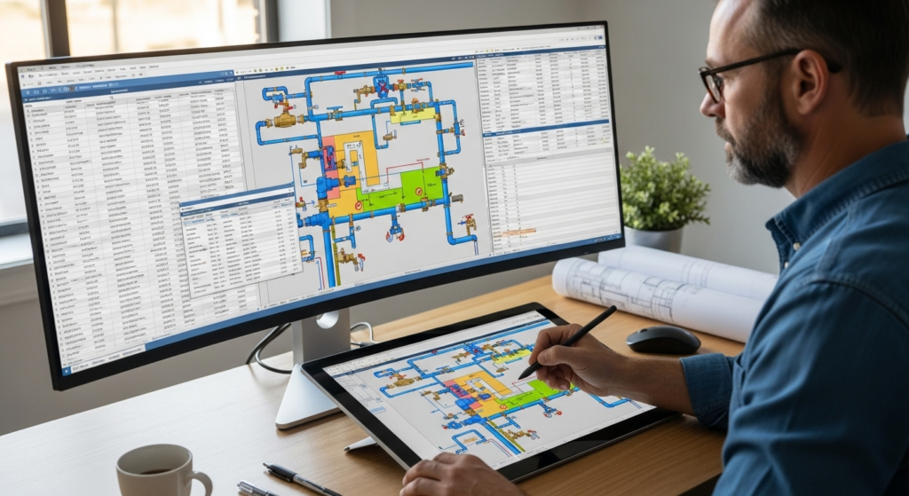 Caption: Estimator reviewing plumbing quantities on-screen