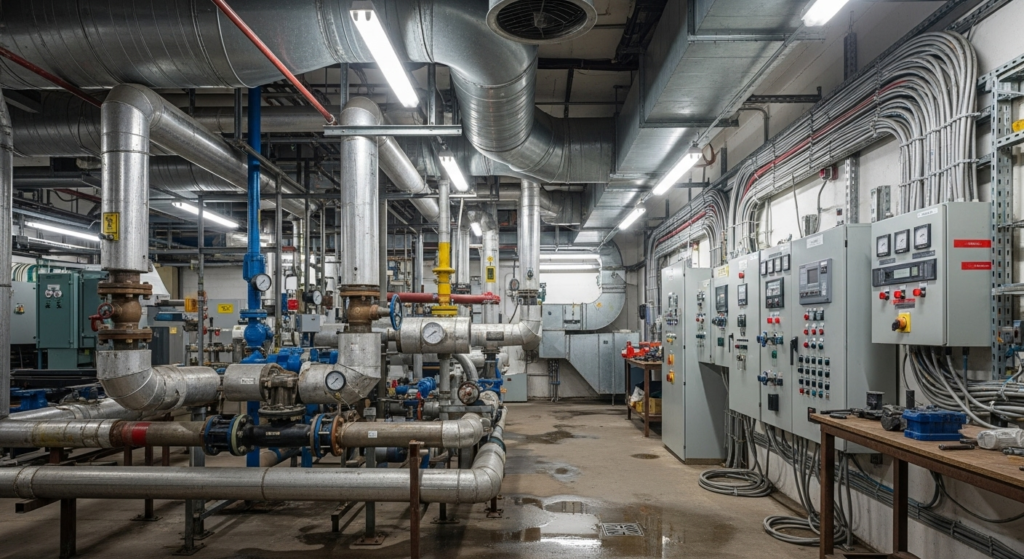 Caption: Mechanical room with pipes, ducts, and panels