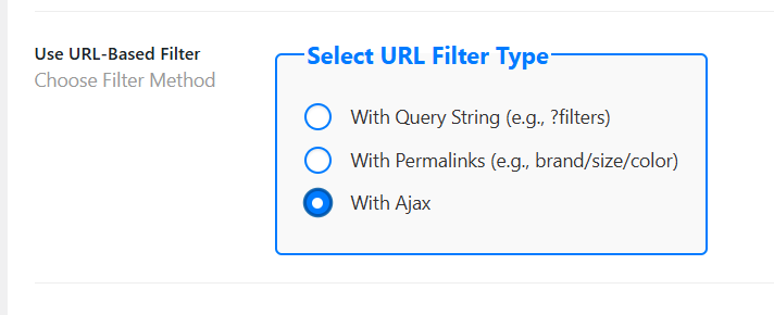 You will also see a setting called “Select URL Filter Type.” If you want smooth filtering without page reloads, choose “with Ajax”. This makes the page update instantly when filters change.