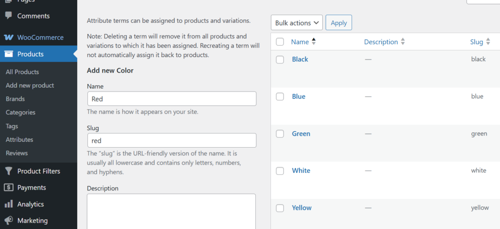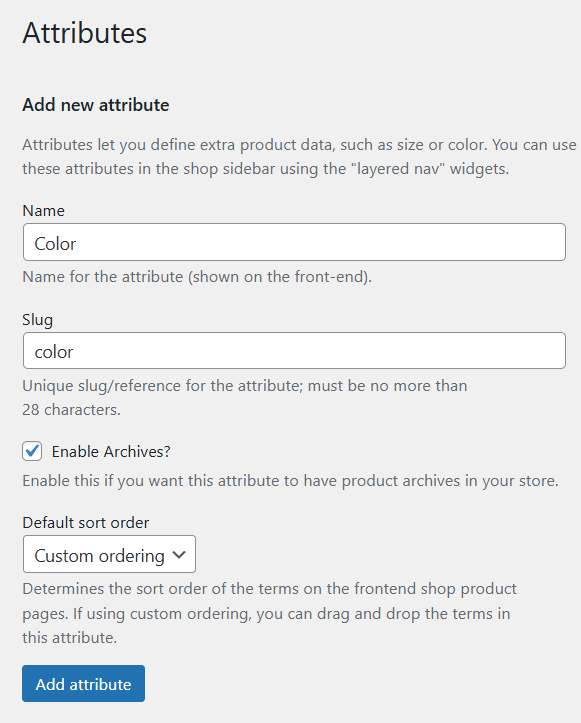 Attributes control things like color, size, material, length, and so on. Go to Products → Attributes