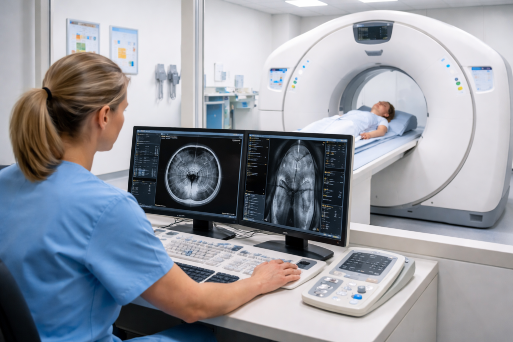 Medical imaging safety: Radiologist performing a CT scan in a hospital radiology room