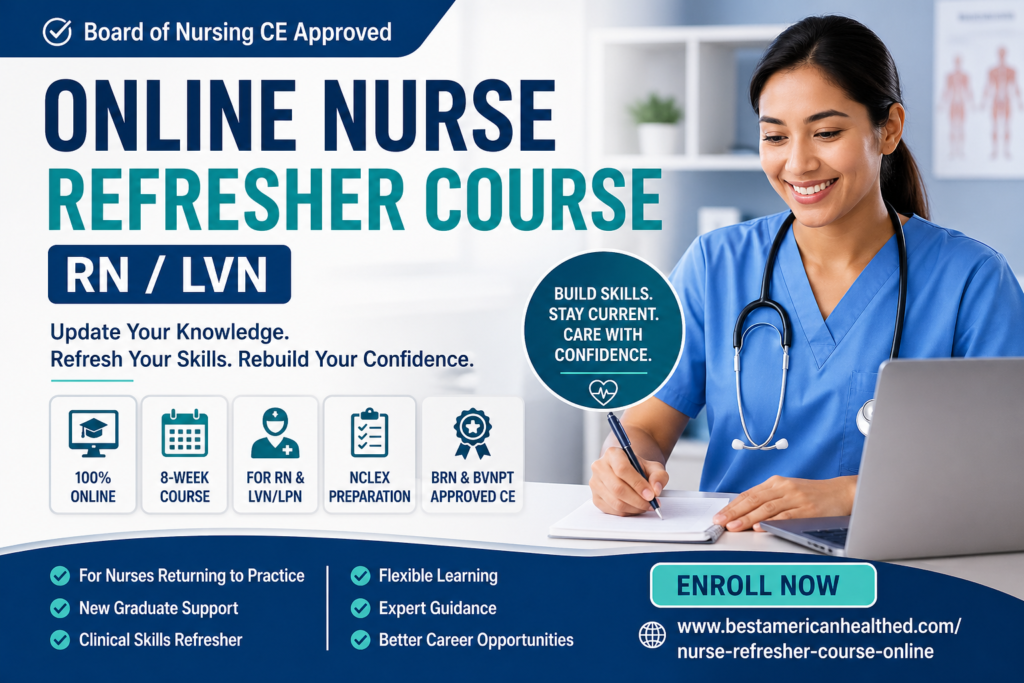 Best American Healthcare University offers a comprehensive Online Nurse Refresher Course that is tailored for both returning professionals and those seeking to strengthen their clinical confidence. This program combines flexibility with hands-on knowledge, making it a practical choice for today’s busy learners.