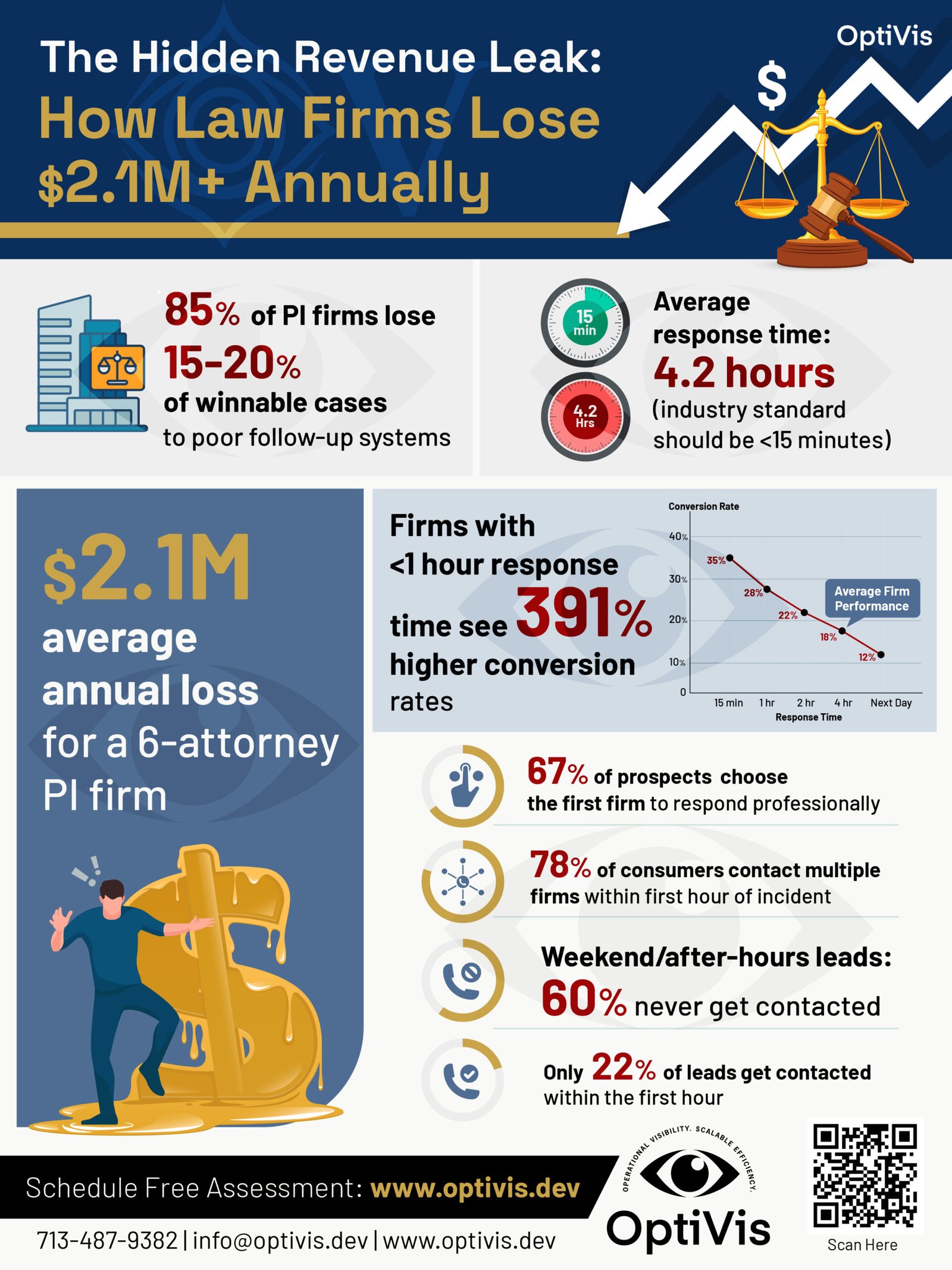 OptiVis specializes in operational automation for law firms, with a focus on eliminating revenue leakage through intelligent intake systems. Our clients achieve an average ROI of 2.4 days and recover $2.1M+ annually in previously lost revenue.