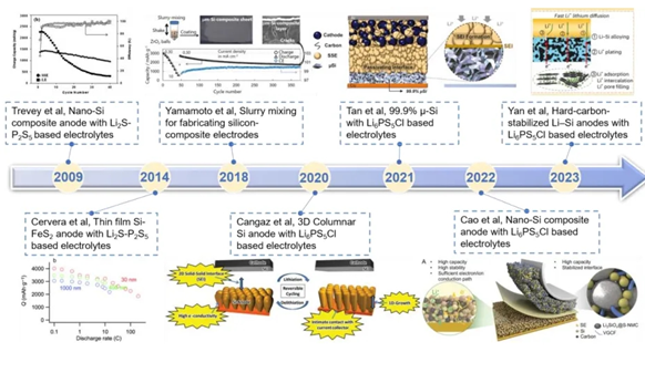 Taking sulfide solid electrolytes as an example, the earliest literature report on silicon being used in sulfide all-solid-state batteries appeared in 2009. In the early days (2009-2014), it was mainly the Se-Hee Lee team that studied silicon-containing anode sulfide all-solid-state batteries. Subsequently (2014-2018), teams from South Korea and Japan began to study this system. Before 2018, silicon-containing anodes were used in sulfide all-solid-state batteries mainly for half-cell research. After 2018, the focus gradually shifted to the research of full batteries, marking that Si-SSB is getting closer to practical application.