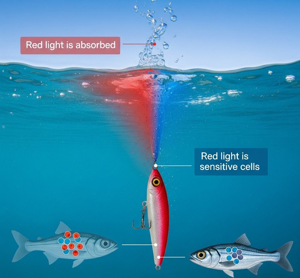 The nature of water has a significant influence on the perception of light and, as such, the color of underwater conditions. Light moving through water is being absorbed and scattered. Red light is absorbed first and vanishes in a few feet, followed by orange, yellow, green, and lastly blue, which penetrates the farthest. That is, a bright red lure near the surface may be camouflaged at deeper levels to dull brown or even black, whereas blues and greens will remain visible much farther. The clarity of water, the turbidity (muddiness) and even time of day (at dawn, dusk, under bright sun) radically change the spectrum of available light and the perception of colors.