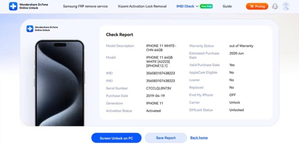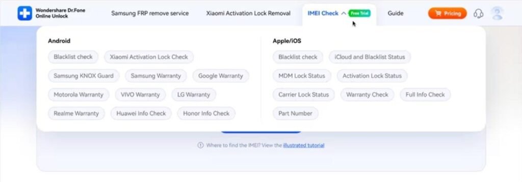 Choosing a reliable platform is essential because not every free IMEI checker delivers accurate results. Among the available options, Dr.Fone Online Unlock stands out with broad coverage for Android and iOS devices. It checks blacklist status instantly, ensuring users avoid blocked phones before making purchases. Moreover, this tool verifies Apple Activation Lock, keeping buyers safe from unusable locked iPhones.