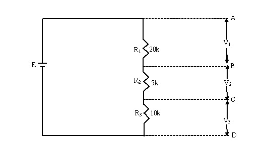 In the series circuit shown in figure 1 above, E = V1 + V2 + V3. This means that in a series connection, the voltage drop in each of the resistors add up to the applied source voltage. The series combination of R1, R2 and R3, becomes a voltage divider. In a series circuit, the ratio between any two voltage drops is the same as the ratio of the two resistances across which these voltage drops occur.
