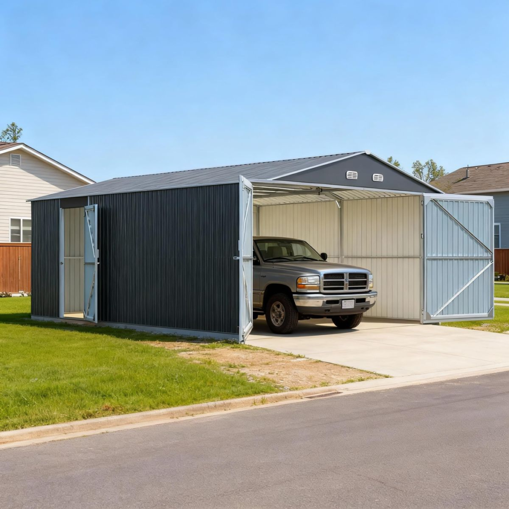 Some shed workshops are designed as garage-style spaces that combine storage and working functions. Vehicles or equipment can be parked on one side while tools, workbenches, and projects occupy the other. With wide doors, sufficient floor space, and heavy-duty construction, this type of shed workshop supports versatile use and future expansion.