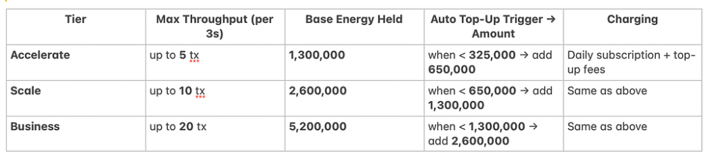 • All tiers continuously monitor and replenish Energy to keep your transactions smooth and interruption-free.