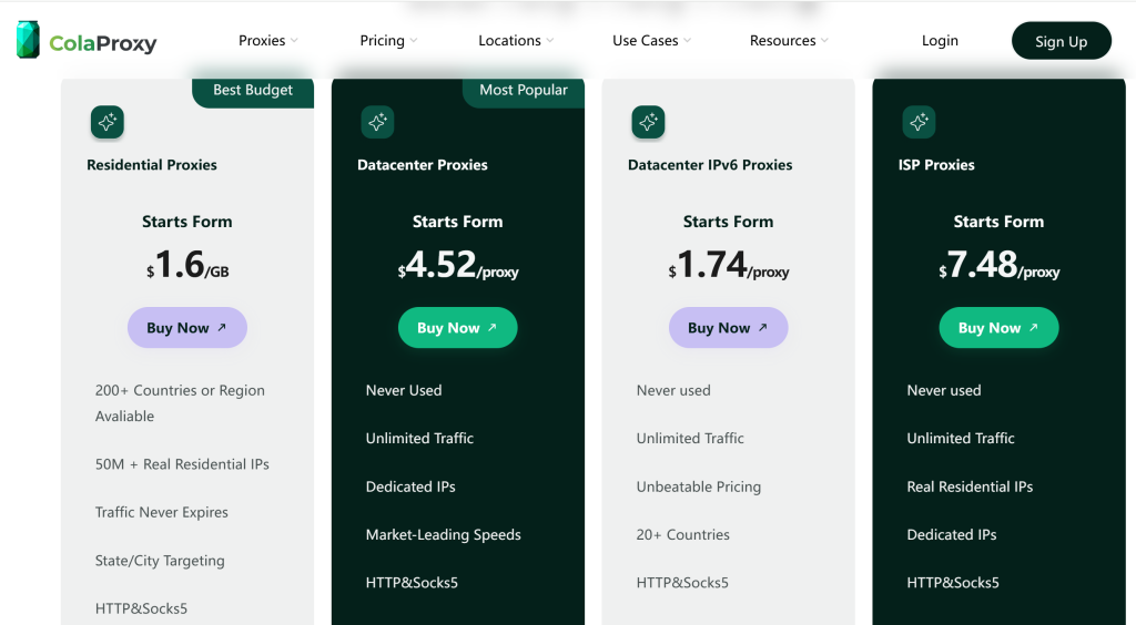 ColaProxy presents itself as a comprehensive proxy provider, offering residential proxies alongside mobile and datacenter options.