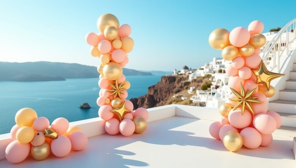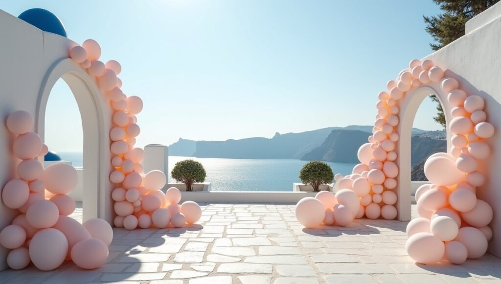 Whitewashed buildings, stone walkways, olive trees, and sea-blue backdrops make balloons stand out beautifully. Designers often choose colors that reflect the country’s aesthetic identity: whites, golds, soft pastels, blues, and earthy tones.